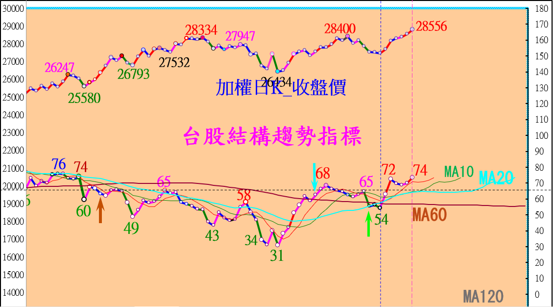 上市櫃結構指標:74分_MA20上揚,多頭格局