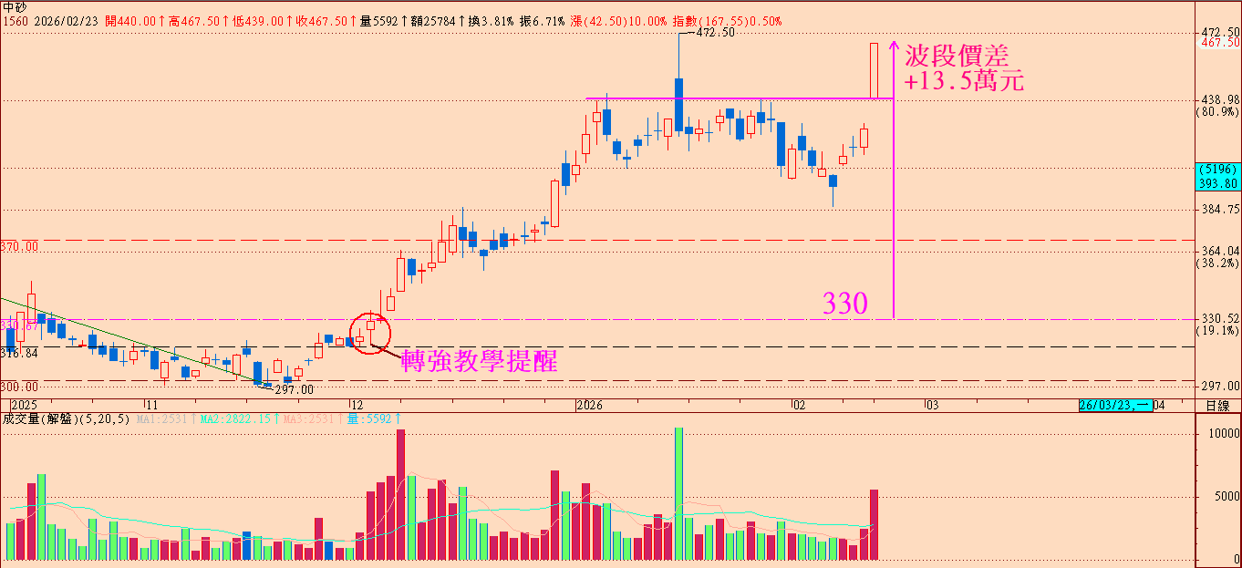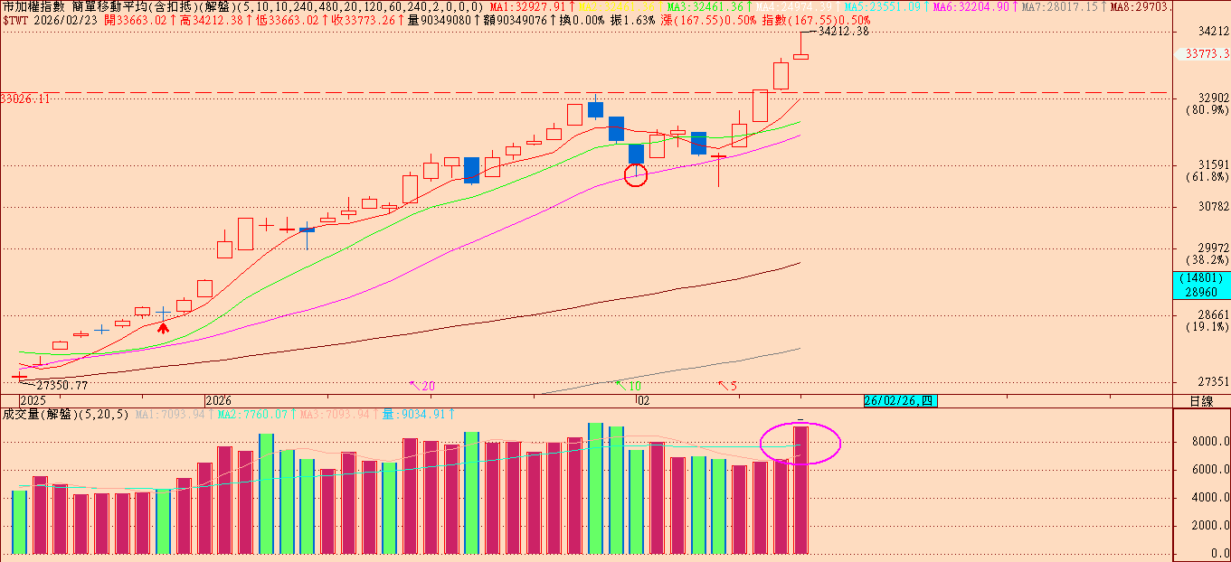 一、大年初七(2/23)新春開盤,台股紅盤日上漲 0.49%,漲幅看似不大,但盤面結構卻透露出更積極的訊號。指數雖未出現激情噴出,卻呈現量價配合穩健、均線支撐有序的格局,這種「穩中帶強」的走法,往往比急漲更具延續性。