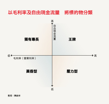 建立自己的投資分析筆記 (一) :公司的分類每個長期能在市場穩定獲利的投資者,手上一定有一份自己專屬的投資筆記,當然這沒有標準的做法,每個人的方法各有不同巧妙之處,身邊滿多朋友常常問我要如何著手建立起自己的名單與筆記,所以就來分享一下心得,個人的做法大致上分為幾個步驟,會依以下的順序慢慢分享:1. 依景氣位置將感興趣的公司分類2. 依不同產業整理出相關的公司3. 針對不同類別的公司訂出分析的原則與標準4. 建立長期的觀察記錄5. 以風險角度考量與決定投資比例 (如同下棋時,你需要利用不同功能的棋子)6. 等待甜美價格的到來個人在進行分析之前,最重要的第一件事,就是公司分類,因為面對不同類型、或是處在不同景氣循環位置的公司,就不能用同一套標準去評價他們,因為如果你用一般的原則去分析長成中的公司,你可能會等不到買進價,或是說當他已經停止成長了,你才要買入,那就更會跌入陷井之中,造成重大的損失,因此,唯有先確定(或是推論)該公司所處的景氣位置,能幫助你使用正確的評價模型,對我而言,這是分析的第一步驟。那麼,應該要如何來進行分類呢?方法可能有很多,大致上的觀念是,只要能明確的區分出成長期、平穩期及衰退期即可,我個人有個簡單的分類法,用毛利率和自由現金流,可以抓出大致上的不同,我用這二個數字當指標,畫出四類型的公司高毛利且有正向的自由現金流公司:這類的公司大都已是一方王者,或者至少也是該產業中的優等生,通常都是屬於成長中的公司也都享有高本益比,因此投資人若是要尋找買點,比較安全的做法可以等待二個時機,一是擴廠,通常在蓋新廠新產線時,伴隨著較大的資本支出,有可能會出現獲利下降的情況,二是景氣的轉折點,當空頭一來,大多數的企業都要衰退,而這類型的公司常常會因為財務體質較健全能撐過不景氣,則此時通常也是相當不錯的買點。不過在分析這類型的公司時,有一個要思考的原則就是,成長的盡頭在哪?當成長型的公司不再成長,甚至開始衰退時,股價的修正往往都是非常劇烈的,因此持續追蹤並觀察各項財務指標是追逐成長型公司所一定要做的功課。低毛利且有正向的自由現金流公司:這類型的公司本身可能處在比較成熟的產業中,不太會再有什麼突破性的技術或是爆炸性的成長,反應在財務體質上,就是偏低的毛利率,但不代表這類型的公司就沒有競爭力,相反的,有時因為處在成熟穩定期,在套用現金流折現公式時,變數較少,反而更容易去計算並掌握合理的價格,再加上若是遇到經營得宜的公司,透過成本控制或是製程升級改善毛利,或是找到產品新的應用,配上本身財務體質優良,或許有機會拉高毛利轉成王牌型公司,股價當然也就有表現的機會。高毛利但自由現金流量為負的公司:毛利率能維持在高檔的企業,說明了其位在相對有競爭力的位置或是本身擁有一定的技術能力,但因產業整體環境處在擴張的戰國時期,因此要維持優勢所要付出的就是不斷的資本支出,公司現金流量不足只好用理財方式來增加財源,也說明了這類的企業在經營上的高槓桿及高壓力,另外股價通常也會有很高的波動。這類型的公司在分析上和第一類公司有點像,大致上都是觀察成長力道是否持續及高毛利是否能維持,只是其增資活動有時常常會影響股本,造成EPS的成長跟不上股本的稀釋,反而出現下降的情況。低毛利、自由現金流量為負的公司:可能因為所處產業已沒落,或是自身的商品在市場上已無競爭力,只能不斷的削價但仍無法挽救向下的沉淪,所以我用黃昏型的公司來稱呼他們,這類型的公司照理說應該不會是價值型投資者感興趣的類型,但為什麼我還是會把他們放在自己長期的追蹤名單中呢?其實扣除掉那些已經死透的公司(有價值的部份都獨立成為子公司、一直不斷彌補虧損減資......之類的),這類型的公司有一個好處,因長期缺乏關注,通常股價淨值比都小於1,一但出現什麼新的好消息,常常有機會一口氣就來個50%到100%的漲幅,只是相對的也伴隨著高風險,所以重點就在於,你能夠瞭解他們多少?願意花多少時間去長期追蹤他們,否則就只是像在買樂透一樣,其實對你的資產成長並無多大的幫助。當然上述的分類方式只是一個例子,你不一樣要像我一樣完全使用毛利率和自由現金流量當成標準,重要的是,只要能夠區別出成長股和成熟企業的不同,然後用不同的評價方式去分析,如此就可以避免買不到或是追太高的情況發生。