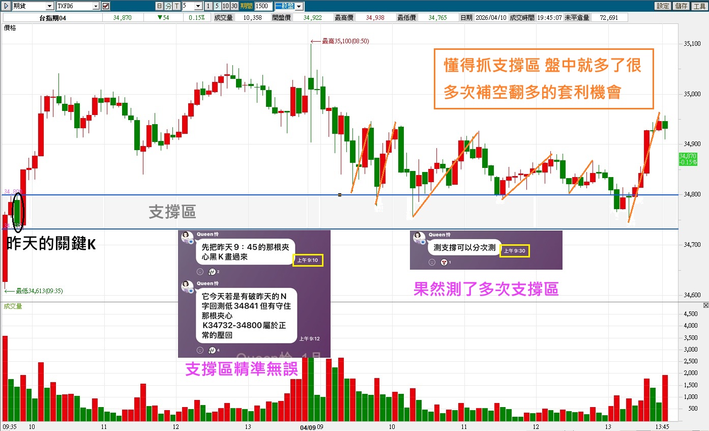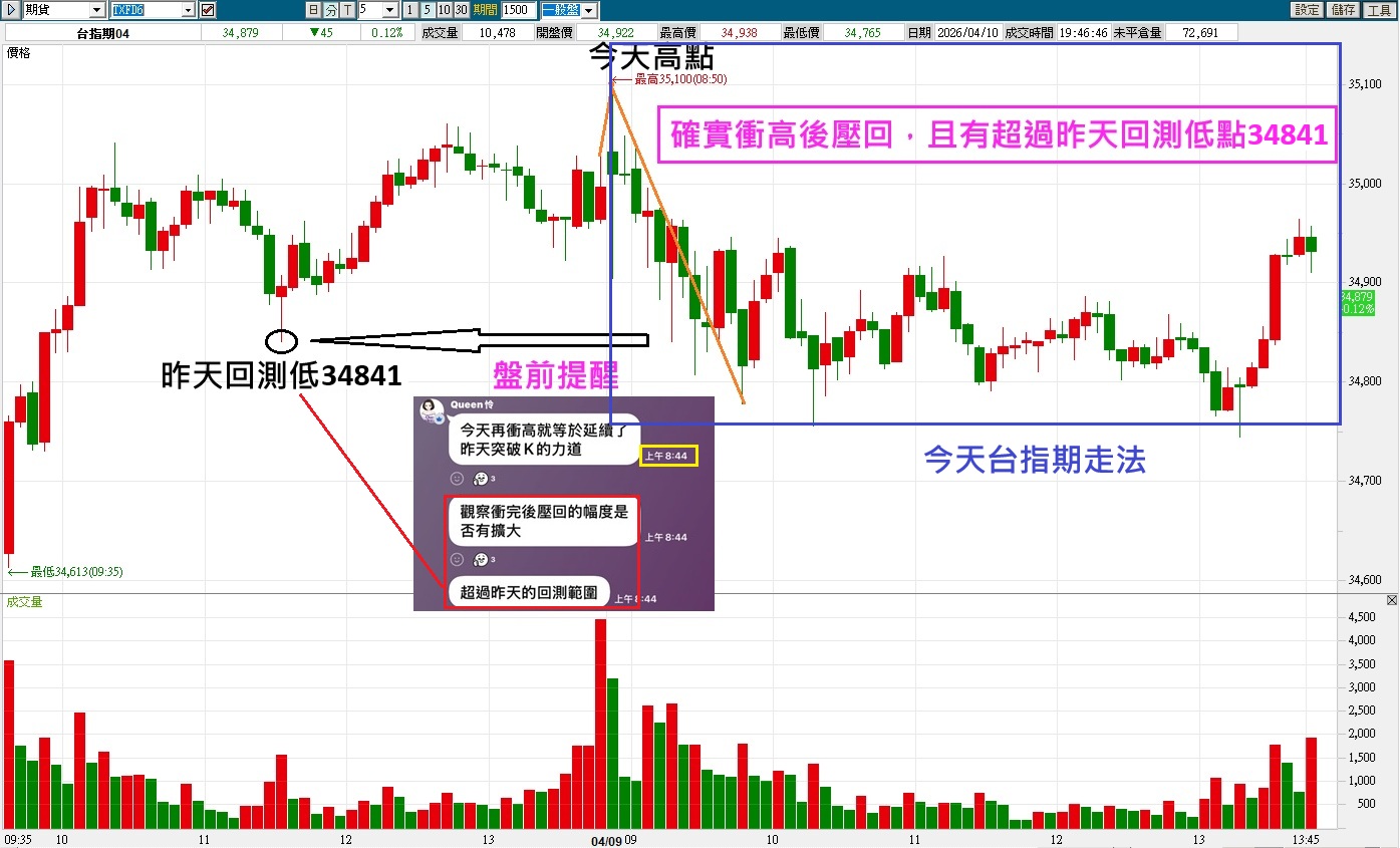 今天盤前從夜盤的走法,已知衝個高後會壓回,並跌破昨天的回測低點34841