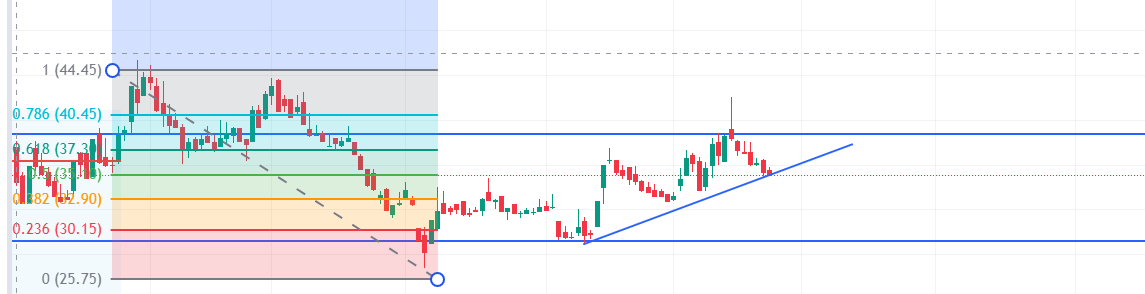 目前股價在斐波那契回調的 0.618(37.37)和 0.786(40.45)之間震盪。這兩個位置通常是比較關鍵的反彈阻力區,如果突破 40.45,股價可能會進一步挑戰更高的阻力位。