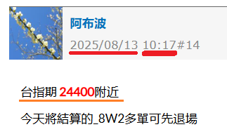 8/13學院的盤中教學中,我們鎖定 24400壓力區 作為退場點,換算台指期價差約 +260點