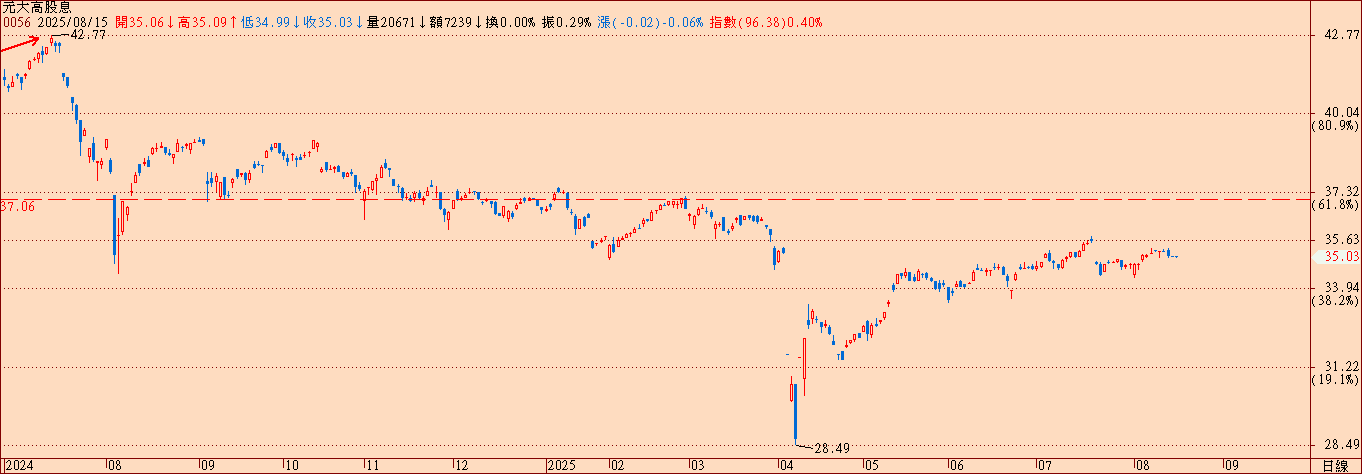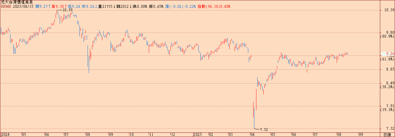 00940 日K~這檔2024年6月曾衝高一波、但以現在位置觀察~仍是有不少籌碼套牢中...看一下歷來人氣都很旺的幾檔ETF:日K