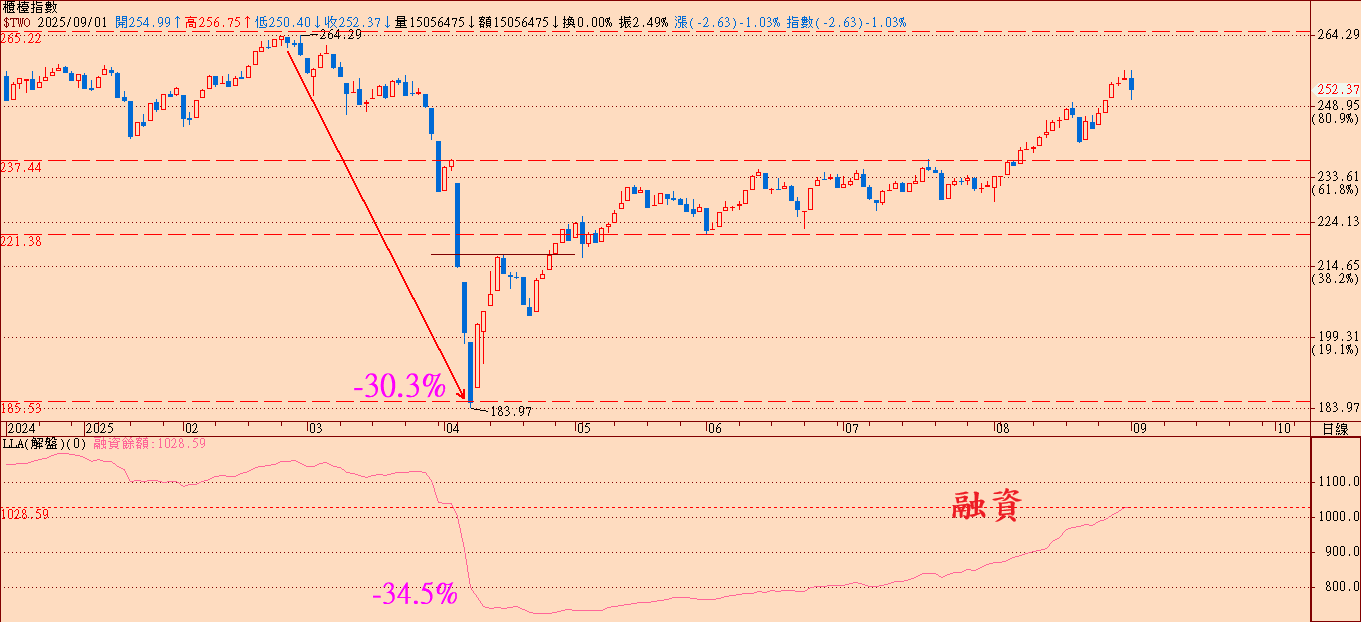 2.台股方面,櫃買市場融資餘額急速上升,已逼近清明股災前的水位。市場投機氛圍濃厚,小型股群起炒作,形成「群魔亂舞」的格局。雖然股市高點難以精準預測,但隨著股價漲高,風險也同步快速累積。此時若過度追價,極可能面臨市場資金斷鏈與股價急跌的風險。