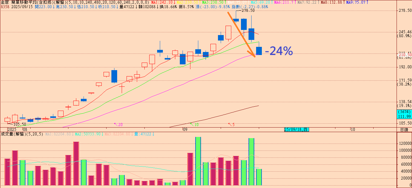 大熱門股8358金居_盤中鎖住跌停板、自本波高點快速拉回-24%