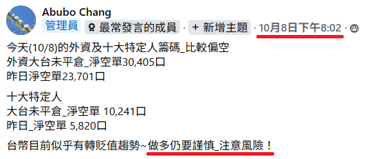 三、阿布早於10/7直播中即警示:「中小型股籌碼凌亂...加權正乖離過大...融資易被斷頭,漲勢僅集中少數權值股_為輪動出貨格局...恐出現加速下跌。」並於10/8臉書社團再次提醒:「做多仍要謹慎_注意風險!。」