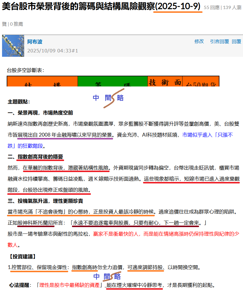 10/8阿布臉書社團《小資台股大翻身》示警:10/9俠客盟學院盤前文提醒同學「短線市場已進入過度樂觀階段,台股恐出現修正或盤頭的風險...指數創高時...可適度調節持股」