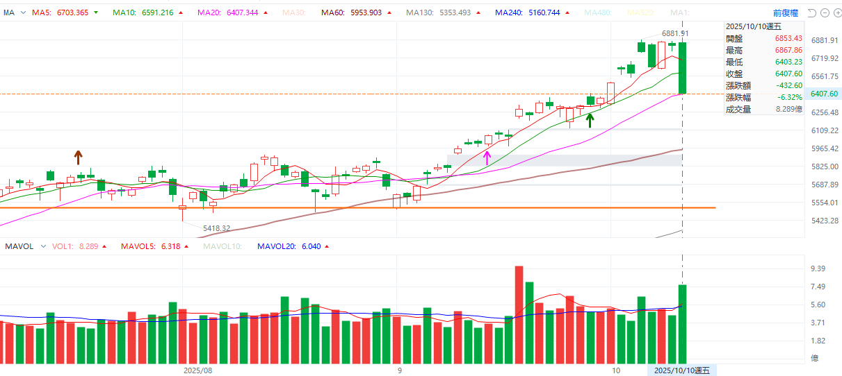 二、受此衝擊,費城半導體指數重挫6.23%,國慶假期期間累計跌幅達6.6%;台積電ADR合計下跌7.84%。以富台指期貨跌幅6.06%換算,預估加權指數下跌1650點以上,考量富台指有個股最高權重20%限制,加權實際跌幅可能更深。