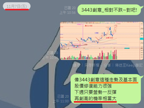 上週五(11/7)台股大跌時_學院Line群組即時教學:今日(11/10)早盤果然亮燈漲停!