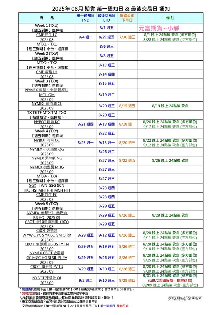 2025年8月期貨 第一通知日&最後交易日 通知
