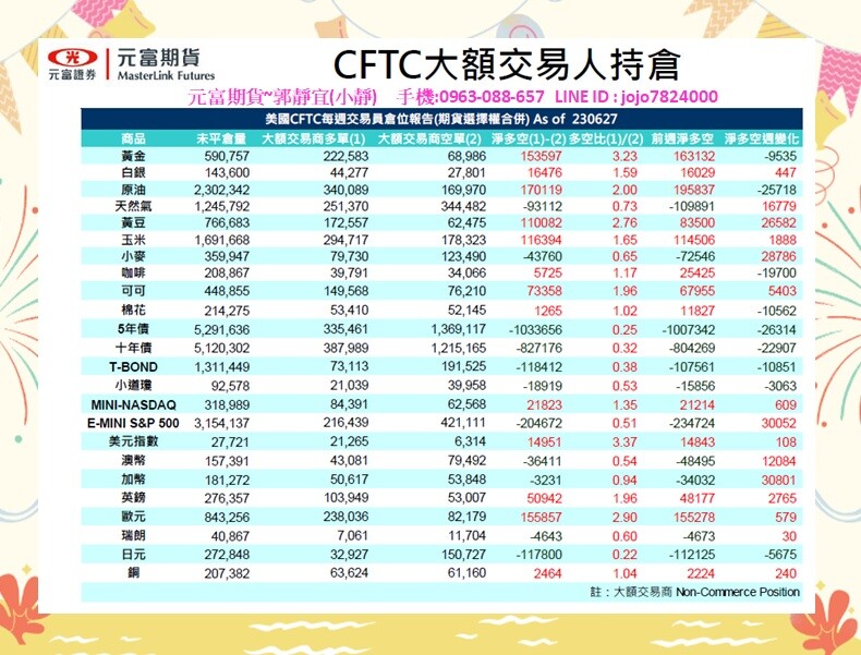 元富期貨-海期專業【7月3日~7月7日海期焦點數據&CFTC大額交易人持倉】#期貨開戶推薦郭靜宜(小靜)#LINE : jojo7824000#期貨全台開戶#期貨線上開戶