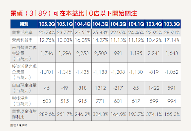 景碩是生產IC載板的公司,這個產業近年來需求量一直有放大,但是投入的公司愈來愈多,整體上算是滿競爭的產業,景碩近8年來營收從122億元成長到2015年的230億元,即便遇上金融海嘯,也只衰退了1年,就馬上從新站起來,但現在股價卻算是長線的低點,最主要的原因在有二,一是營收自從2011年以來,便在220億元~250億元上下徘徊,無法維持過往的高成長;二是景碩的毛利率從原先的30%近年來慢慢的降到25%,營業利益率更是從高檔的18%~19%掉到13%上下,EPS從2014年開始衰退,因此市場給與的本益比也下降,股價也從上波最高點約140元來到現在70元左右。因此個人對於像這樣已經在產業中站有穩定地位的公司,評估方式會變得相對簡單很多,一是觀察營收變化,若無再出現較高的成長幅度,那就會選在本益比約10倍以下時開始關注它。