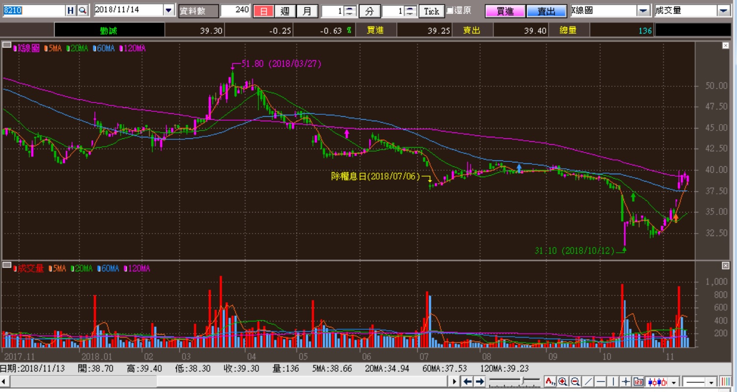 回到股價方面,勤誠股價在今年(2018)3月51.8元見頂後,一路走跌,最低來到前波美股暴跌影響的31.1元,最大的原因不外乎毛利率從14-16年維持在接近30%的水準,掉到17年的26%多,在營收沒有大幅成長下又加上匯損,17年的EPS衰退了24%,18年前二季營收雖然成長但毛利更是走低來到23%,市場失望之下,股價也走軟了一段時間,不過在Q3財報公佈後,這個趨勢出現了變化,營收開始出現大幅的成長,且毛利率和營業利率終於拉高,回到26%的水準,公司的說法是因為中國方面的營收拉高,Q4目前10月營收仍然亮眼,11月營收對比去年同期較低水位,應該仍然是可以輕鬆過關,所以目前觀察的重點就在於