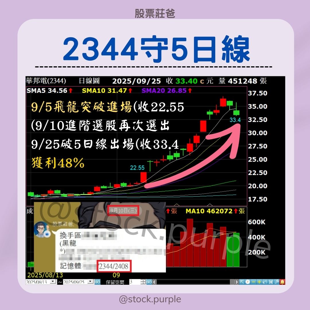 最後於9/25跌破5日線,收盤以33.4元賣出,獲利48%。