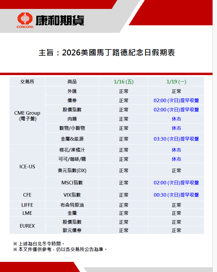 美國馬丁路德紀念日(MLK Day)海外期貨交易時間調整一覽