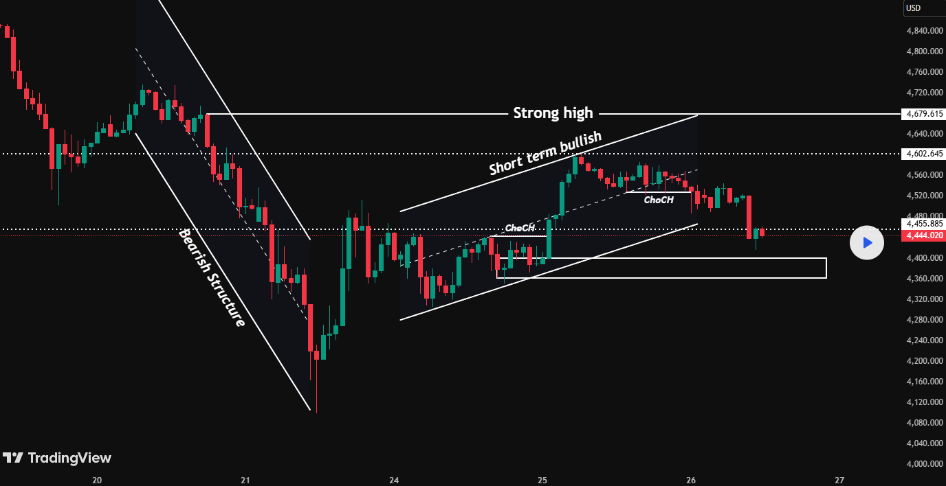 在H1上,價格形成了一個上升通道,但已經印出多個ChoCH信號,表明看漲控制正在減弱。最近的反彈將價格推回到FVG區域,暗示效率正在被填補。