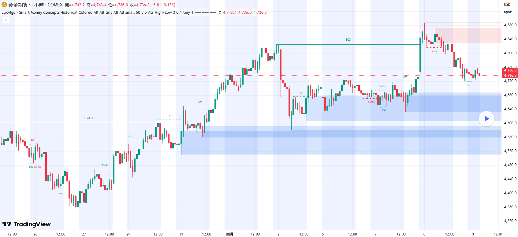 黃金(XAUUSD)一小時盤勢目前已出現關鍵轉折訊號,市場結構從原本的多頭趨勢轉為短線偏空。前段行情持續創高並出現多次BOS(突破結構),顯示多頭動能強勁,但在4800至4840區間形成高點後,出現明顯賣壓與ChoCH(結構轉折),代表多頭結束,空方開始接管市場主導權。